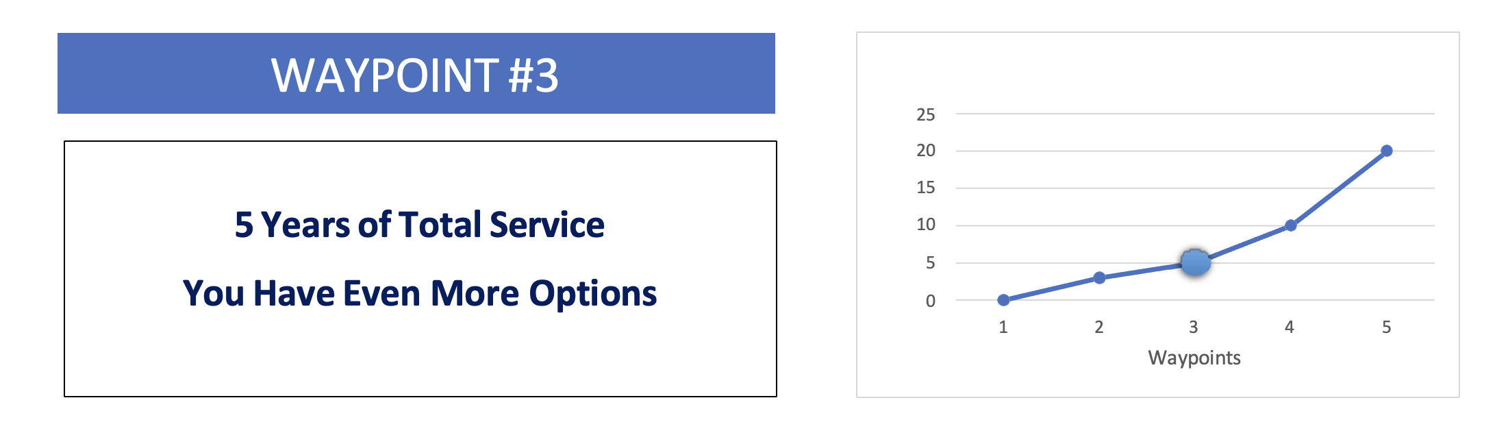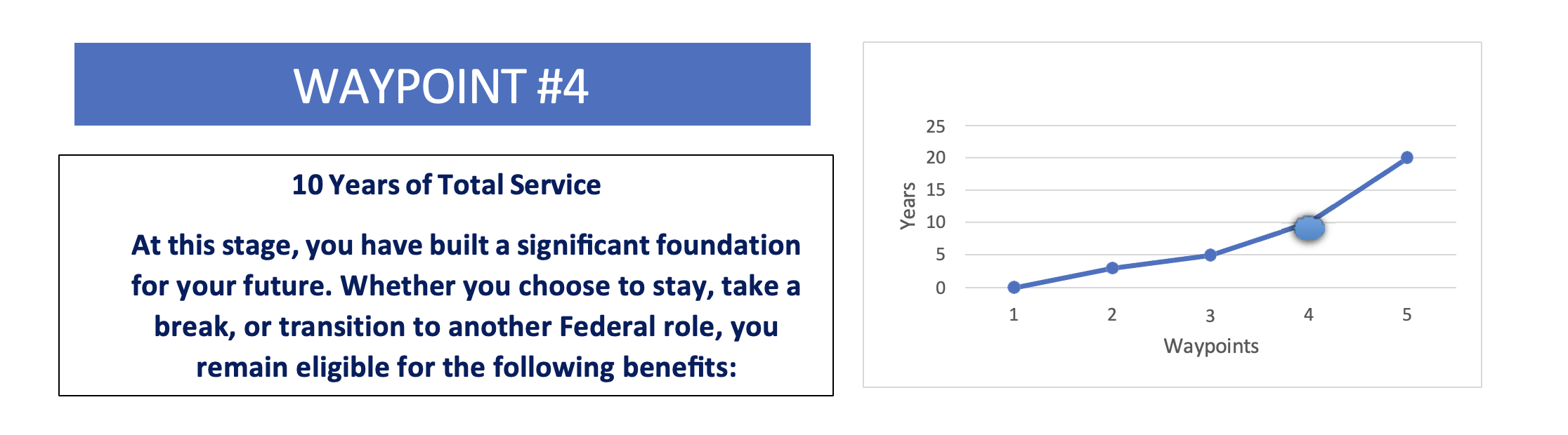 By viewing your career as a series of waypoints, you shift focus from the distant goal of retirement to the progress you're making right now. As you pass these milestones, each accomplished waypoint encourages you to continue federal service and reach the next one. Even if gaps between milestones occur, this structured approach highlights the advantages of long-term employment.