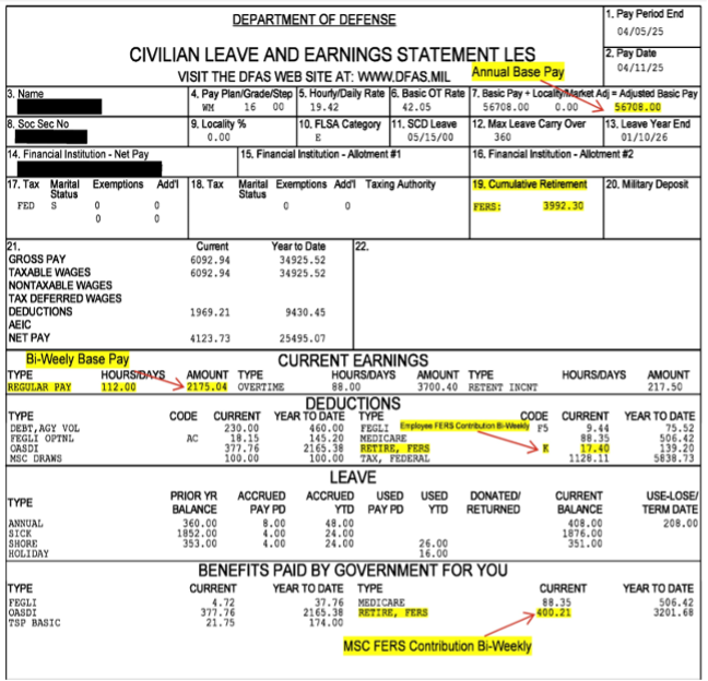The cumulative retirement contributions in Box #19 define the amount of your FERS or CSRS retirement annuity (CIVMAR Pension) that is tax-free, as these were made as "after-tax" contributions. The cumulative amount does not include Agency (MSC) contributions. This is not the same as the monthly pension you will receive in retirement—it is your personal contribution to the retirement fund.